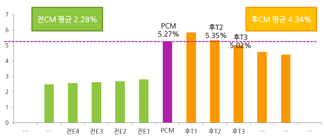 이는 프로그램 방송 전 광고의 평균 시청률(2.28%)보다 2배 이상 높은 수치이며, 방송 직후 광고 평균 시청률(4.34%)보다도 높다. 광고단가는 시청률에 따라 달라진다는 점에서 업계가 주목해온 ‘지상파 중간광고’ 위력이 확인된 셈이다.
