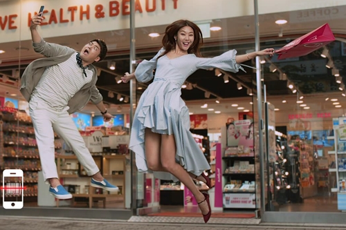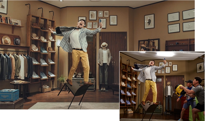 작년 캠페인 종료 후 진행한 소비자 광고 반응 조사에서 거론된 아쉬운 부분이 바로 각각의 서비스 편들이 하나의 롯데 옴니쇼핑 서비스로 보이지 않는다는 것이었습니다. 올해는 이를 묶을 수 있는 공통의 장치적 요소들을 심어놓았는데, 그중 가장 눈에 띄면서도 재미있는 포인트가 바로 점프씬입니다.