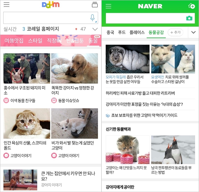 네이버 동물공감에 하루 앞서 카카오도 모바일에 ‘동물탭’을 새로 선보였다. 1인 가구 및 반려동물 인구가 급증하면서 동물 관련 콘텐츠에 대한 관심이 높아진 트렌드를 반영한 것으로, 다음앱 및 다음 모바일 첫 화면에서 전용 카테고리로 만나볼 수 있다.