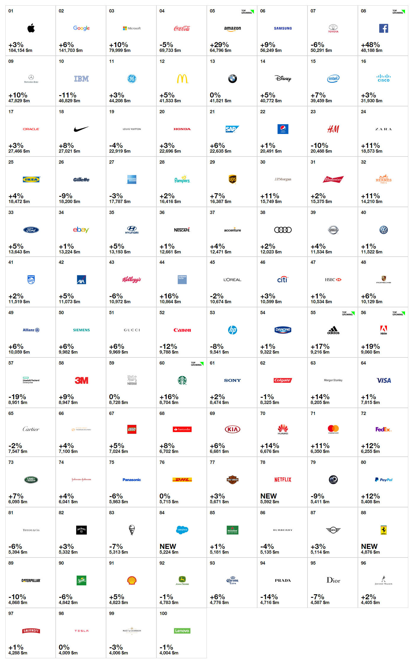 넷플릭스는 올해 처음 100대 브랜드에 진입함과 동시에 78위를 차지했다. 아울러 세일즈포스닷컴(Salesforce.com)이 84위에 새롭게 올랐으며, 페라리는 88위로 2013년(98위) 이후 3년 만에 100위권에 재진입했다.