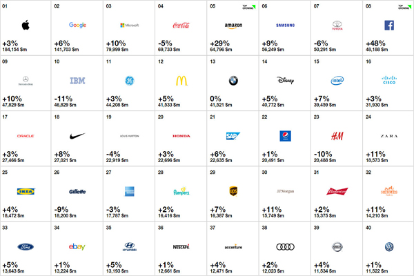 세계적인 브랜드 컨설팅그룹 인터브랜드가 25일 발표한 ‘2017 글로벌 100대 브랜드’를 결과에 따르면 최상위 10개 브랜드는 애플, 구글, 마이크로소프트, 코카콜라, 아마존, 삼성, 토요타, 페이스북, 메르세데스 벤츠, IBM 순으로 나타났다. 이들을 포함한 100대 브랜드 가치 총액은 전년 보다 4.2% 성장한 1조8717억 달러(약 2114조2700억원)로 집계됐다.