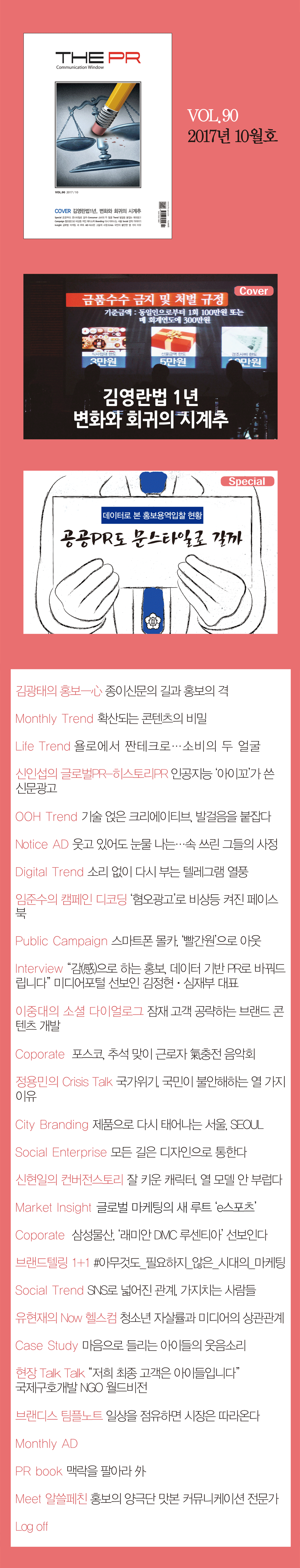 정기 구독 신청 SNS 기사보내기 페이스북(으)로 기사보내기 트위터(으)로 기사보내기 카카오톡(으)로 기사보내기 네이버밴드(으)로 기사보내기 네이버블로그(으)로 기사보내기 핀터레스트(으)로 기사보내기 링크드인(으)로 기사보내기 URL복사(으)로 기사보내기 이메일(으)로 기사보내기 다른 공유 찾기 기사스크랩하기 이 기사를 공유합니다 페이스북(으)로 기사보내기 트위터(으)로 기사보내기 카카오톡(으)로 기사보내기 네이버밴드(으)로 기사보내기 네이버블로그(으)로 기사보내기 핀터레스트(으)로 기사보내기 링크드인(으)로 기사보내기 URL복사(으)로 기사보내기 닫기 더피알 다른 기사 보기 저작권자 © The PR 더피알 무단전재 및 재배포 금지 관련기사 더피알 2017년 9월호 안내 더피알 2017년 8월호 안내 더피알 2017년 7월호 안내 더피알 2017년 6월호 안내 더피알 2017년 5월호 안내 더피알 2017년 4월호 안내 더피알 2017년 3월호 안내 더피알 2017년 2월호 안내 더피알 2017년 1월호 안내 개의 댓글 회원로그인 작성자 비밀번호 댓글 내용입력 댓글 정렬 최신순 추천순 답글순 BEST댓글 BEST 댓글 답글과 추천수를 합산하여 자동으로 노출됩니다. 닫기 더보기 댓글삭제 삭제한 댓글은 다시 복구할 수 없습니다. 그래도 삭제하시겠습니까? 비밀번호 닫기 댓글수정 댓글 수정은 작성 후 1분내에만 가능합니다. 본문 / 400 비밀번호 닫기 내 댓글 모음 닫기