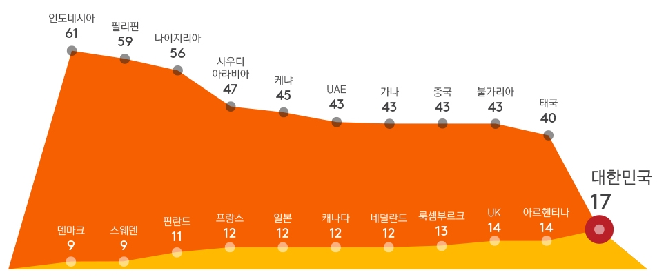 한국인 응답자의 17%만이 ‘소셜미디어상 정보 대부분이 믿을 만하다’고 답한 것. 바꿔 말하면 83%는 소셜미디어 상의 정보를 그다지 신뢰하지 않는다는 의미다. 특히 한국은 덴마크(9%), 스웨덴(9%), 핀란드(11%) 등에 이어 소셜 신뢰도가 낮은 국가 10위에 올랐다.