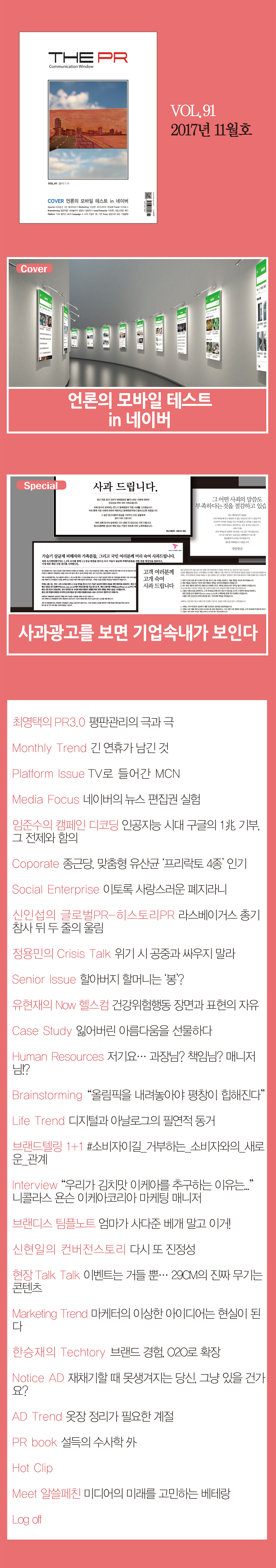 더피알 2017년 11월호 안내 기사입력 2017.11.01 10:01 최종수정 2017.11.01 11:08 기자명 더피알 본문 글씨 줄이기 본문 글씨 키우기 다른 공유 찾기 바로가기
