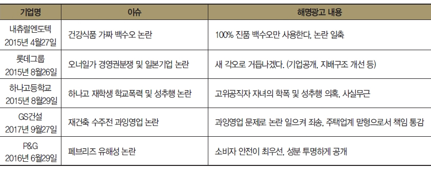 해명광고는 기업 논란 대응 차원에서 집행한 것으로 풀이된다. 사과하긴 애매하고, 오해는 바로잡아야 할 때 ‘죄송합니다’ 대신 ‘새롭게 거듭나겠다’고 에둘러 표현하는 것이다. 총 5곳의 기업이나 단체가 <표>에서처럼 이런 방식의 광고를 내보냈다.