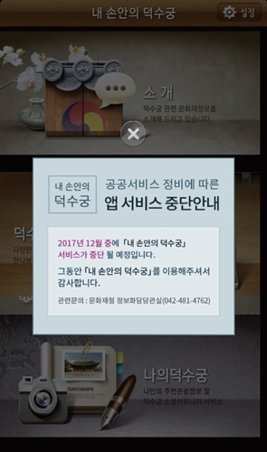 대표 사례가 문화재청에서 각각 10억원과 6억원을 들여 내놓은 ‘내손안의 덕수궁(2013년 출시)’과 ‘내손안의 경복궁(2014년 출시)’ 앱이다. 이들 앱은 관람정보나 행사 등을 증강현실을 이용해 안내하는 역할을 맡아왔다. 하지만 16억원짜리 두 공공앱의 최종 성적표는 올해 3월 기준으로 사용자 ‘0명’에, 다운로드 수 약 1만건씩을 기록한 게 전부다. 이런 이유로 이 앱들은 수 억원의 세금만 투입하고 올해 12월자로 서비스를 종료키로 했다.