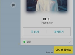 멜론 with Kakao 서비스 역시 채널탭에 오픈된다. 멜론과 카카오 계정을 연동한 유료 회원이면 카카오톡 내에서 전곡 감상이 가능하다. 역시 채팅방 하단 + 버튼에서도 선택할 수 있다.