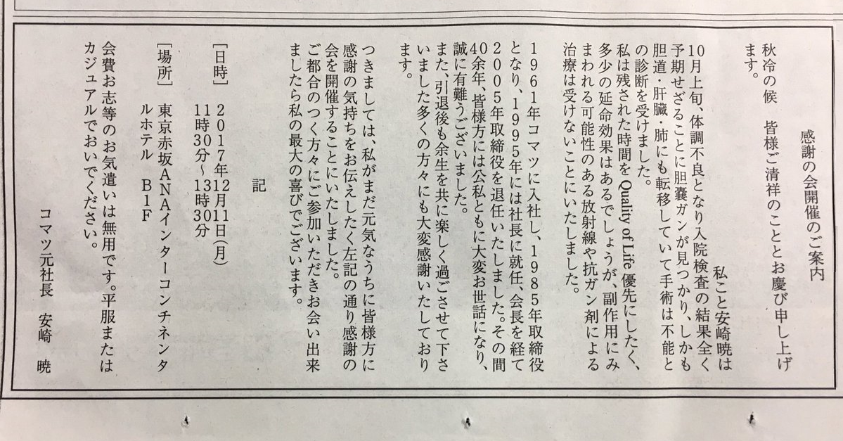 [더피알=정지원] 얼마 전 암 선고를 받은 한 CEO의 생전 장례식이 이슈였다. 일본 건설기계 분야 대기업인 고마쓰의 안자키 사토루 전 사장이 니혼게이자이신문에 낸 작은 광고가 작은 파장을 일으킨 것이었다.