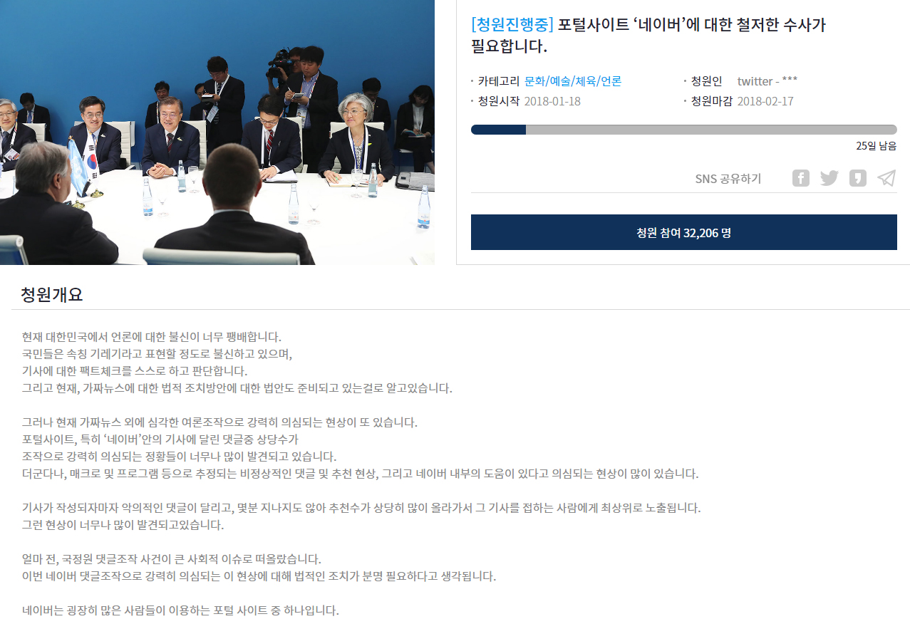 지난 18일에 올라온 ‘포털사이트 ‘네이버’에 대한 철저한 수사가 필요합니다‘는 글에서 청원자는 “포털사이트, 특히 ‘네이버’ 안의 기사에 달린 댓글중 상당수가 조작으로 강력히 의심되는 정황들이 너무나 많이 발견되고 있습니다”며 조작이라고 의심되는 링크 또한 첨부하면서 “반드시 네이버에 대한 수사가 있어야 한다고 생각합니다”고 주장했다.