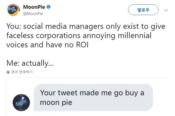 100년 전통의 초코파인 브랜드인 문파이(@MoonPie)의 브랜드 계정에서는 언젠가 브랜드 트윗 계정에 대한 비판의 목소리에 이어지는 글 타래에서 이런 글을 올려 인기를 끌었다.
