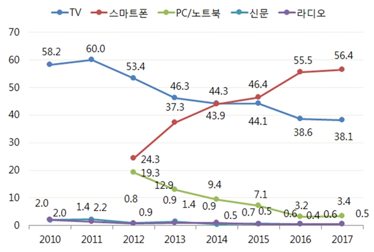 특이한 점은 TV의 경우 매체 중요도에선 하향세가 뚜렷했지만 하루 평균 매체 이용시간 면에선 2시간 48분으로, 스마트폰(1시간 21분)과 라디오(18분)에 비해 압도적으로 많았다.