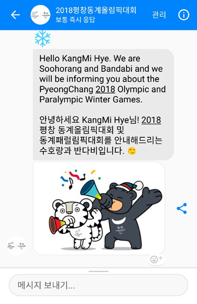 [더피알=강미혜 기자] 2018 평창동계올림픽 개막을 3일 앞두고 페이스북 챗봇이 나왔다. 경기 일정과 티켓 구매 등 기본 정보를 제공한다. 단, 영어와 한국어 서비스만 가능하다.