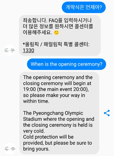 반면, 영어 질문(When is the opening ceremony?)엔 “개막식은 오후 7시(메인이벤트는 8시)에 시작되니 제시간에 입장하세요”란 답변과 함께 “개·폐막식이 열리는 평창올림픽 스타디움이 매우 추우니 (방한용품을) 가져가세요”란 비교적 상세한 설명이 덧붙었다.