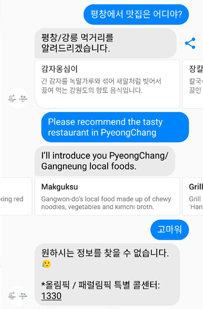 다만, 평창올림픽 챗봇은 정보를 요하지 않는 대화 시도는 대부분 인식하지 못했다.