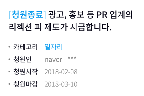 2월 8일 청와대 국민청원에는 ‘광고, 홍보 등 PR업계의 리젝션 피 제도가 시급합니다’라는 제목의 글이 올라왔다. 글쓴이는 서비스 대행을 맡기는 클라이언트가 ‘갑’이라는 우월적 지위를 이용해 양질의 제안(서)을 공짜로 받는 걸 당연시하는 문화가 개선돼야 한다며 ‘리젝션 피(Rejection Fee, 탈락보상금)’ 도입을 주장했다.