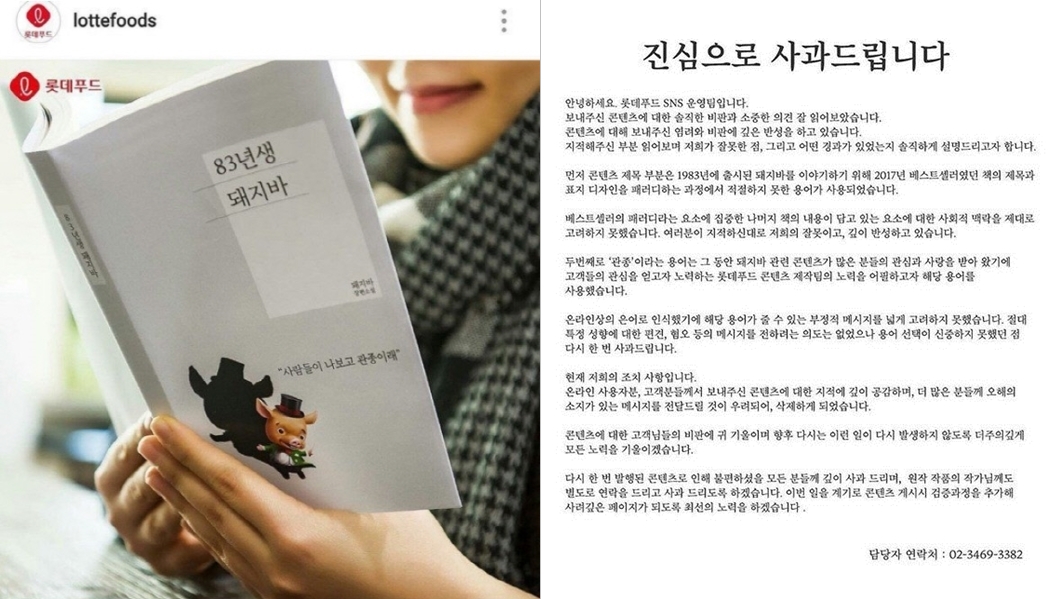 롯데푸드 역시 해당 게시물을 삭제하고 “베스트셀러 패러디에 집중한 나머지 책이 담고 있는 맥락을 고려하지 못했다”며 사과문을 올렸다.
