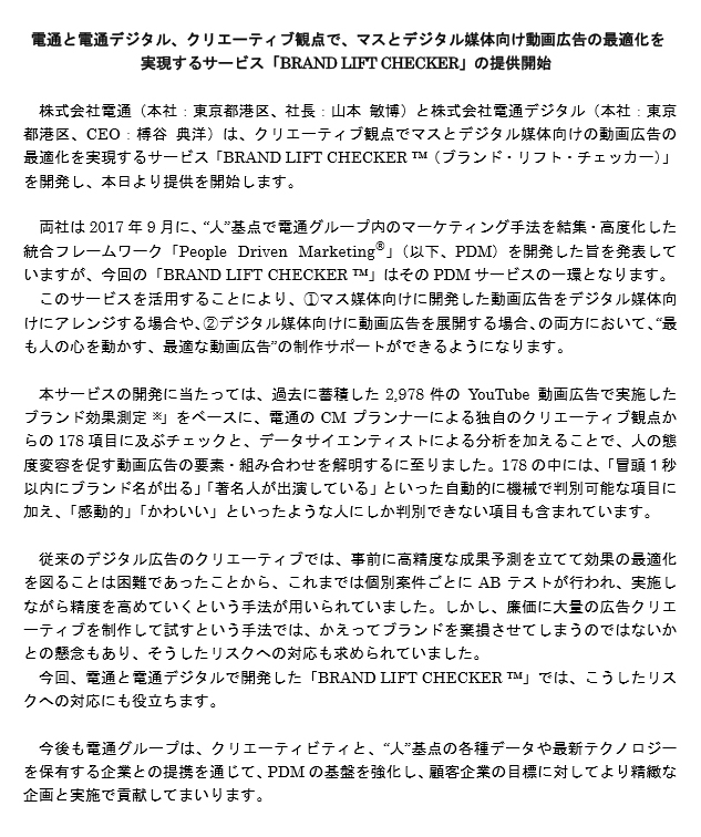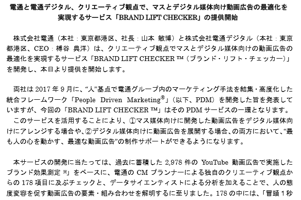 PDM 실천의 일환으로 덴츠는 작년 12월 초에 브랜드 리프트 체커(Brand Lift Checker)라는 서비스를 제공한다고 발표했다. 미국의 구글이 2010년대 초 브랜드 리프트(Brand Lift)를 발표한 내용을 더욱 발전시킨 것으로, 영문이름에서도 알 수 있듯이 덴츠가 한 일은 체커(Checker)를 더했을 뿐이다. 이 서비스는 과연 어떤 것인가?