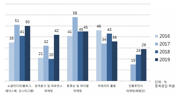 동영상 및 바이럴 마케팅은 45%로 지난해와 동일했고, 검색광고 및 퍼포먼스 마케팅은 20%p 이상 크게 증가해 42%를 기록했다.