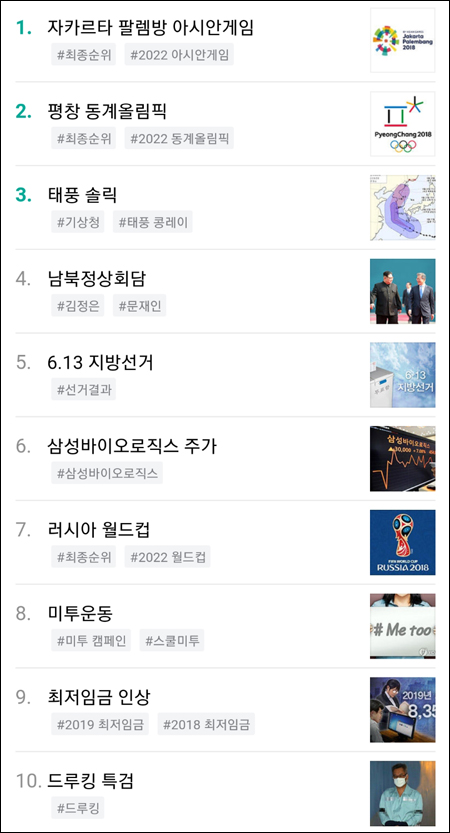남북관계 개선에 이정표를 세운 남북정상회담이 4위에 올랐고 6·13 지방선거가 5위, 네이버 댓글 시스템 변화를 가져온 드루킹 특검이 10위를 차지했다. 삼성바이오로직스 주가(6위)와 미투운동(8위), 최저임금 인상(9위) 등 사회적으로 큰 논란을 불러일으킨 사건과 한반도를 관통한 태풍 솔릭(3위)에 대한 관심 또한 높았다.