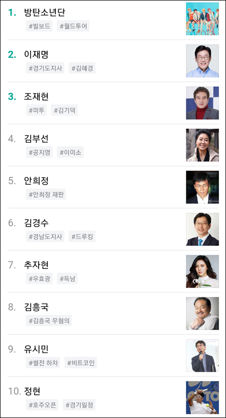 이와 함께 드루킹 사건 연루 의혹을 받고 있는 김경수 경남도지사가 6위, 정계를 떠나 작가와 방송인으로 활발하게 활동하다 노무현재단 이사장이 된 유시민이 9위에 올라 눈길을 끌었다.