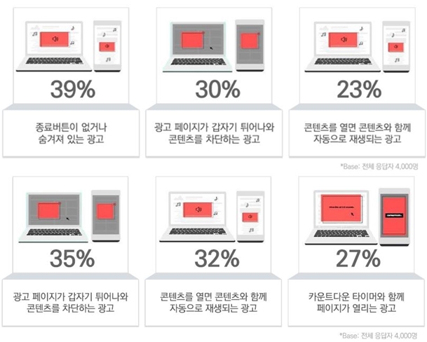 ‘콘텐츠를 열면 함께 자동으로 재생되는 광고’(32%)와 ‘카운트다운 타이머와 함께 페이지가 열리는 광고’(27%)도 소비자 입장에서 피하고픈 광고로 꼽혔다.