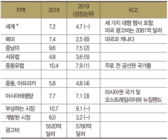<표1>의 세계 광고비 성장률(*)에 따르면 2018년에는 빅 이벤트인 러시아월드컵, 평창동계올림픽 그리고 미국 중간선거 광고비가 포함돼 있다.