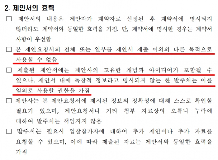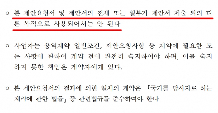 즉, 경쟁입찰에 참여하는 것도 업체가 부담해야 할 몫이고, 최종적으로 탈락하더라도 제안서에 기재한 아이디어조차 사용 못하고 그대로 사장할 것을 요구하는 것이다.