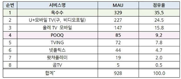 유료구독형 OTT 시장 현황 (2018년 월간 실사용자수 기준. 단위: 만명, %)