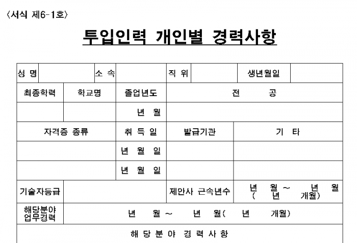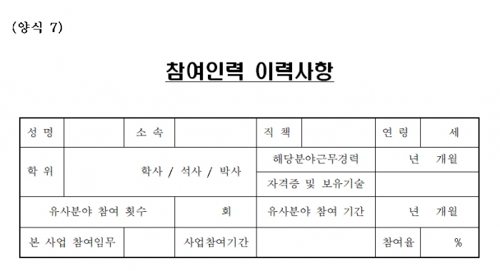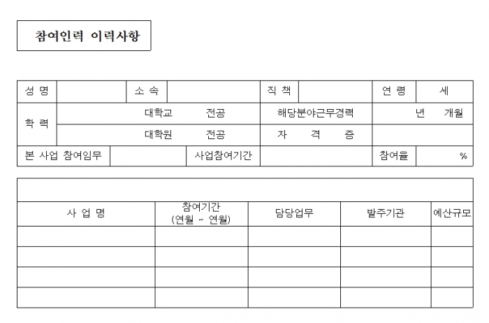 아울러 그 아래로 ‘참여인력 이력사항’을 또다시 표로 정리, 학력란에 ‘OO 대학교 OO 전공’이라고 보다 구체적으로 설명하고 있다.