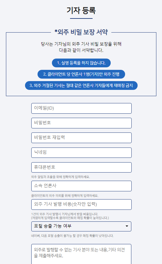 흥미로운 대목은 회원 가입 절차에서 ‘외주 기사 발행 비용’을 기자 스스로 입력하도록 한다는 점이다. 작성된 기사의 포털 송출 가능 여부도 체크 항목에 들어있다.