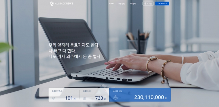 최근 언론계 안팎에서 입길에 오르는 곳은 올백뉴스(allbacknews.com)라는 사이트다. ‘우리 옆자리 동료기자도 한다! 나 빼고 다 한다. 나도 기사 외주해서 돈 좀 벌자!’는 도발적인 홍보문구를 내세워 기자들의 투잡(two job)을 독려한다.