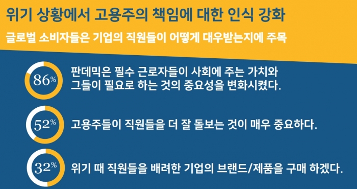 그럼에도 소비자들은 위기 상황에서 대부분 기업의 상황을 이해하는 것으로 나타났다. 응답자의 89%가 코로나 여파로 인해 기업이 고용인들에게 해고와 휴직을 권고할 수 있다고 보면서도 감염병 영향을 완화하기 위해 직원을 배려한 창의적인 해법을 마련하길 기대했다.