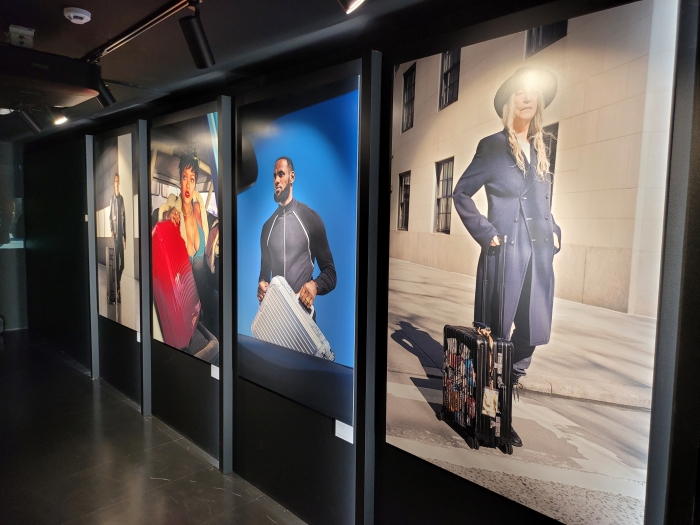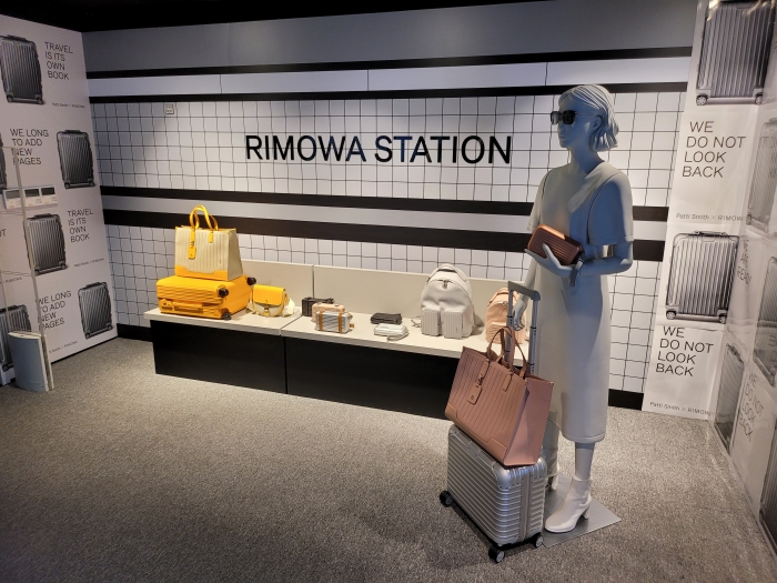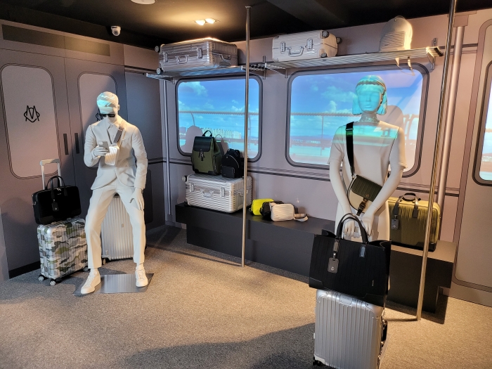 다음 칸으로 넘어가니 지하철 내부와 지하철 역을 테마로 예쁘게 전시된 리모와 제품들이 보였다. 특이한 제품은 정적으로 전시하고, 일반적인 제품군은 좀 더 다양한 장치를 통해 지루하지 않게끔 한 전략이 돋보였다. 힙해보이는 마네킹과 제품이 잘 어우러졌다.