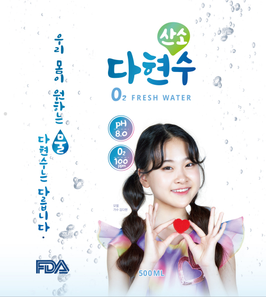 미국FDA 인증을 받은 '다현수'는 칼슘, 마그네슘, 칼륨 등 미네랄 성분이 자연 융해된 pH7.8~8.0 약알칼리성 원수에 산소를 용해하여 물맛이 더욱 좋고 목 넘김이 부드러운 제품이다.