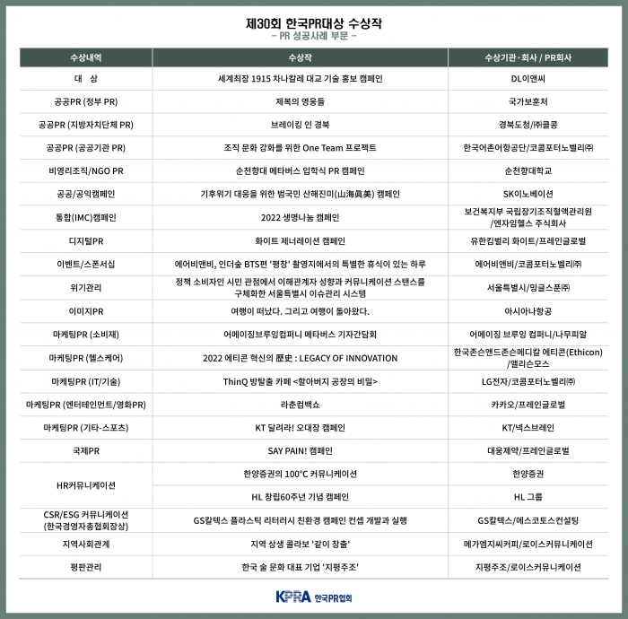 카테고리별 최우수상으로는 ▼정부 PR 부문 ‘제복의 영웅들(국가보훈처)’, ▼지방자치단체 PR 부문 ‘브레이킹 인 경북(경북도청, 클콩)’, ▼공공기관 PR 부문 ‘조직 문화 강화를 위한 One Team 프로젝트(한국어촌어항공단, 코콤포터노벨리)’, ▼비영리조직/NGO PR 부문 ‘순천향대 메타버스 입학식 PR 캠페인(순천향대학교)’, ▼공공/공익 캠페인 부문 ‘기후위기 대응을 위한 범국민 산해진미 캠페인(SK이노베이션)’, ▼통합(IMC) 캠페인 부문 ‘2022 생명나눔 캠페인(보건복지부 국립장기조직혈액관리원, 엔자임헬스)’, ▼디지털PR 부문 ‘화이트 제너레이션 캠페인(유한킴벌리 화이트, 프레인글로벌)’, ▼이벤트/스폰서십 부문 ‘에어비앤비, 인더숲 BTS편 ’평창‘ 촬영지에서의 특별한 휴식이 있는 하루(에어비앤비, 코콤포터노벨리)’, ▼위기관리 부문 ‘서울특별시 이슈관리 시스템(서울특별시, 밍글스푼)’, ▼이미지PR 부문 ‘여행이 떠났다. 그리고 여행이 돌아왔다(아시아나항공)’, ▼마케팅PR(소비재) 부문 ‘메타버스 기자간담회(어메이징 브루잉 컴퍼니, 나무피알)’, ▼마케팅PR(헬스케어) 부문 ‘2022 에티콘 혁신의 歷史(한국존슨앤드존슨메디칼 에티콘(Ethicon), 앨리슨모스)’, ▼마케팅PR(IT) 부문 ‘ThinQ 방탈출 카페 <할아버지 공장의 비밀>(LG전자, 코콤포터노벨리)’, ▼마케팅PR(엔터테인먼트) 부문 ‘라춘컴백쇼(카카오, 프레인글로벌)’, ▼마케팅PR(스포츠) 부문 ‘KT 달려라! 오대장 캠페인(KT, 넥스브레인)’, ▼국제PR 부문 ‘SAY PAIN! 캠페인(대웅제약, 프레인글로벌)’, ▼HR커뮤니케이션 부문 ‘한양증권의 100℃ 커뮤니케이션(한양증권)’과 ‘HL 창립60주년 기념 캠페인(HL 그룹)’, ▼지역사회관계 부문에는 ‘지역 상생 콜라보 ‘같이 창출’(메가엠지씨커피, 로이스커뮤니케이션)’, ▼평판관리 부문 ‘한국 술 문화 대표 기업 ‘지평주조’(지평주조, 로이스커뮤니케이션)’가 선정되었다. 한국경영자총협회장상인 CSR/ESG 커뮤니케이션 부문은 ‘GS칼텍스 플라스틱 리터러시 친환경 캠페인 컨셉 개발과 실행(GS칼텍스, 에스코토스컨설팅)’이 수상한다.