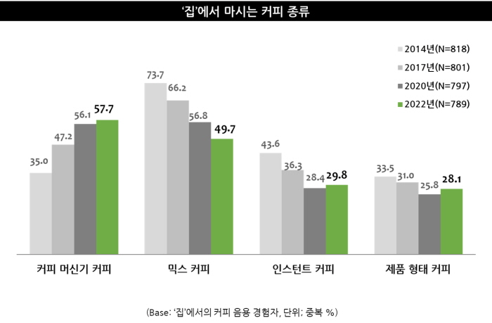 2014년에 73.7%에 달했던 믹스커피 음용 인구는 2017년 66.2%, 2020년 56.8%로 하향 곡선을 이어오더니 올해 조사에서는 49.7%를 기록했다. 반대로 커피 머신기를 이용한다는 응답은 2014년 35.0%에서 57.7%로 수직상승했다.