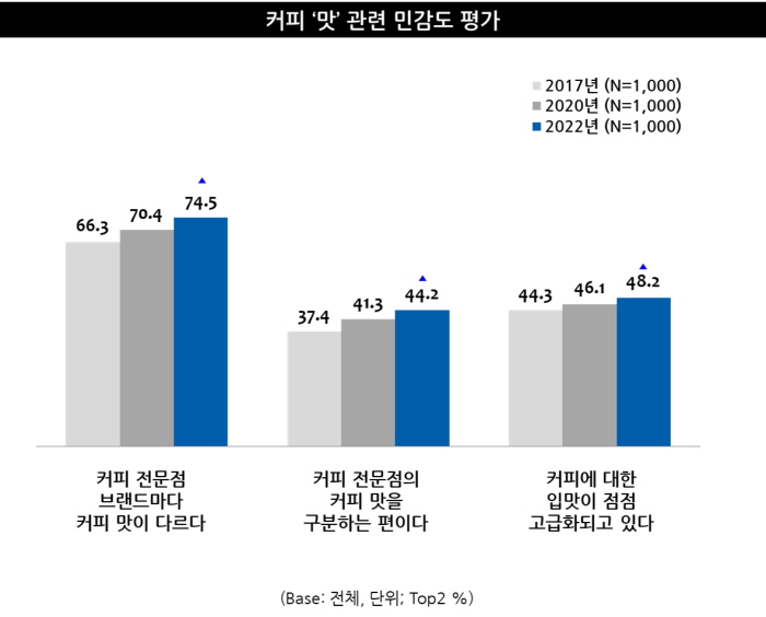특히 ‘커피 전문 브랜드마다 커피 맛이 다 다르다’는 인식은 2017년 66.3%에서 2020년 70.4%, 2022년 74.5%로 계속 늘어났으며, 본인이 커피 전문점의 커피 맛을 구분할 수 있다(37.4% → 41.3% → 44.2%)는 응답도 지속적으로 늘어나고 있다.