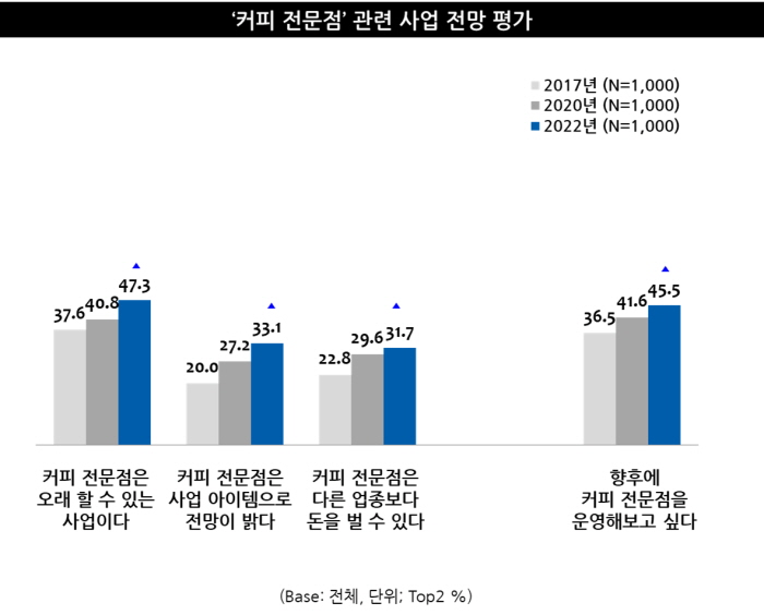 이에 따라 커피 전문점은 오랫동안 안정적으로 운영할 수 있는 사업(37.6%(2017) → 40.8%(2020) → 47.3%(2022))이며, 향후 사업 아이템으로서 전망이 밝다(20.0%(2017) → 27.2%(2020) → 33.1%(2022))는 인식이 꾸준히 증가하고 있었고, 앞으로 커피 전문점을 직접 창업해보고 싶다(36.5%(2017) → 41.6%(2020) → 45.5%(2022))는 인식도 소폭 증가했다.