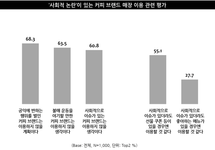 공익에 반하는 행동을 한 커피 브랜드 매장(68.3%)이나 불매 운동을 야기할 만한 이슈가 판단되는 매장(63.5%), 사회적으로 이슈가 있는 커피 브랜드 매장(60.8%)은 이용하지 않을 것이라는 응답이 높게 나타났고, 선호하는 커피 메뉴 때문에 사회적 이슈를 감안하면서까지 해당 매장을 계속 이용할 것 같다(27.7%)는 인식은 낮은 편이었다.