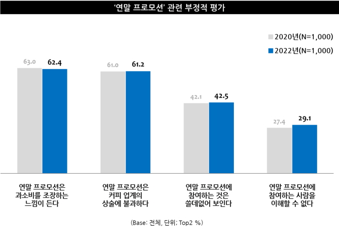 커피 전문점의 대표적 마케팅 전략으로 꼽히는 ‘연말 프로모션’에 대해서는 전반적으로 긍정 평가 비중이 줄어들었다.
