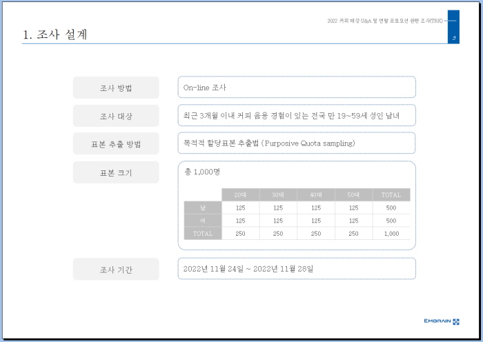 시장조사전문기업 엠브레인 트렌드모니터는 최근 3개월 이내 커피 음용 경험이 있는 전국 만 19~59세 성인 남녀 1000명을 대상으로 ‘커피 매장 U&A 및 연말 프로모션’ 관련 조사를 실시한 결과를 7일 발표했다.