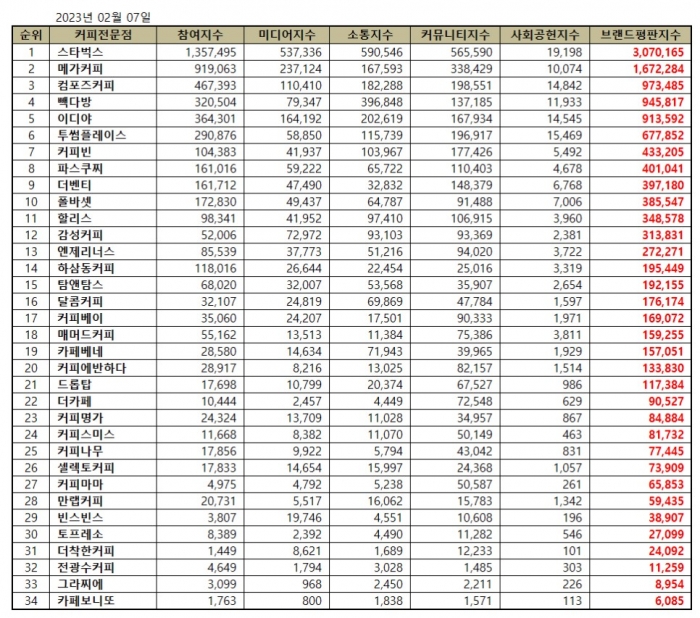 2023년 2월 커피전문점 브랜드평판 순위는 스타벅스, 메가커피, 컴포즈커피, 빽다방, 이디야, 투썸플레이스, 커피빈, 파스쿠찌, 더벤티, 폴바셋, 할리스, 감성커피, 엔제리너스, 하삼동커피, 탐앤탐스, 달콤커피, 커피베이, 매머드커피, 카페베네, 커피에반하다, 드롭탑, 더카페, 커피명가, 커피스미스, 커피나무, 셀렉토커피, 커피마마, 만랩커피, 빈스빈스, 토프레소, 더착한커피, 전광수커피, 그라찌에, 카페보니또 순으로 나타났다.