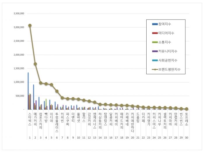 한국기업평판연구소는 매달 국내 브랜드의 평판지수를 측정해 브랜드 평판지수 변화량을 발표하고 있다. 이번 커피전문점 브랜드평판지수는 2023년 1월 7일부터 2023년 2월 7일까지의 브랜드 빅데이터 분석 결과다.