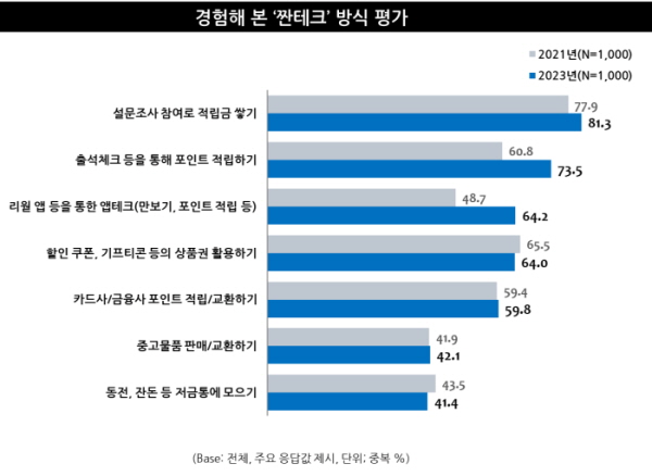 짠테크 실천 방식으로는 설문조사 참여(81.3%, 중복응답), 출석체크 적립금 모으기(73.5%), 리워드 앱을 활용한 앱테크(64.2%), 상품권 활용(64.0%), 카드사 포인트 교환(59.8%) 등의 순으로 나타났다.