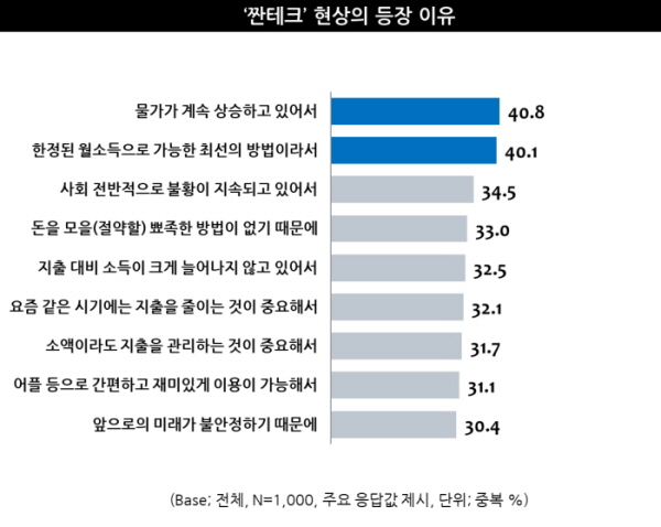 응답자들은 짠테크의 등장 이유로 물가 상승(40.8%, 중복응답)과 한정된 소득으로 가능한 최선의 재테크(40.1%), 사회 전반적으로 지속되고 있는 불황(34.5%) 등을 꼽았다.
