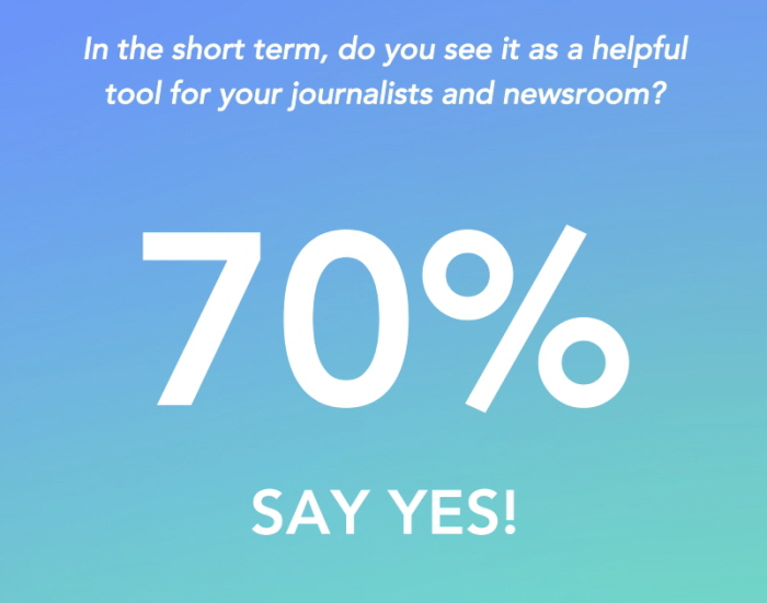 응답자들 사이에서 AI에 대한 전망은 대체로 긍정적이어서 약 70%는 생성형 AI를 ‘기자 및 뉴스룸에 유용한 도구’로 보고 있다고 답했다.