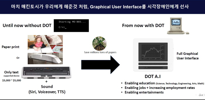 그러다가 미국 생활중 다니던 교회에서 점자 성경책을 보게됐는데, 우리가 읽는 한 권짜리 성경책이 점자로는 22권 정도 되는 분량으로 돼있는 것을 보고 큰 충격을 받았고, 인류 역사 속에 계속 시각장애가 있었는데 왜 이 분야에는 혁신이 안됐나 라는 질문을 갖게 됐다.