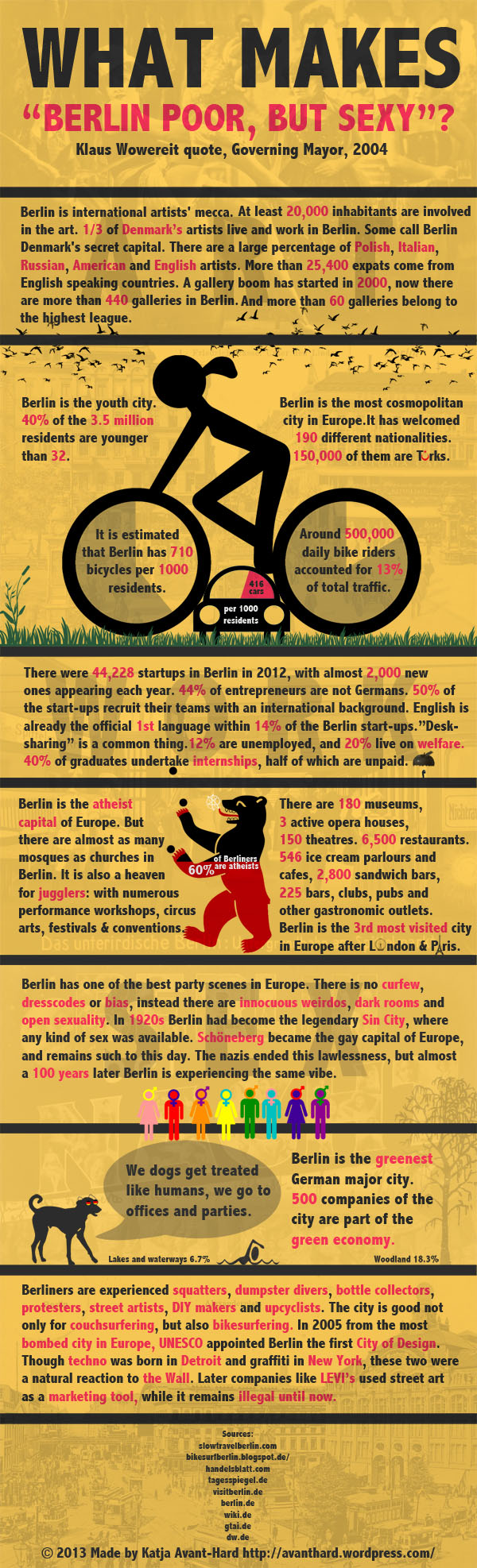 오래전 파리가 그랬듯 베를린은 낮은 집세와 물가를 활용하여 전국, 전 유럽, 전 세계의 ‘새로운 생각’을 가진 ‘Poor but Sexy Guy’들을 불러들였다.