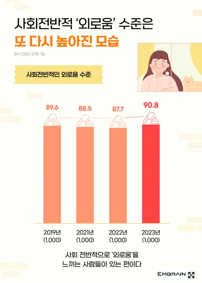 시장조사 전문기업 엠브레인 트렌드모니터는 전국 만 19~59세 성인 남녀 1000명을 대상으로 ‘2023 외로움 관련 인식 조사’를 실시해 7월 13일 결과를 발표했다.