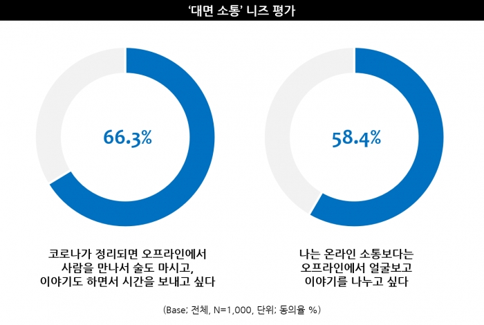 전체 응답자 10명 중 7명(66.3%)은 직접 만나 시간을 보내고 싶다는 마음을 내비쳤다. 온라인 소통보다는 직접 얼굴 보고 이야기를 나누고 싶다(58.4%)는 응답도 절반 이상에 달했다.